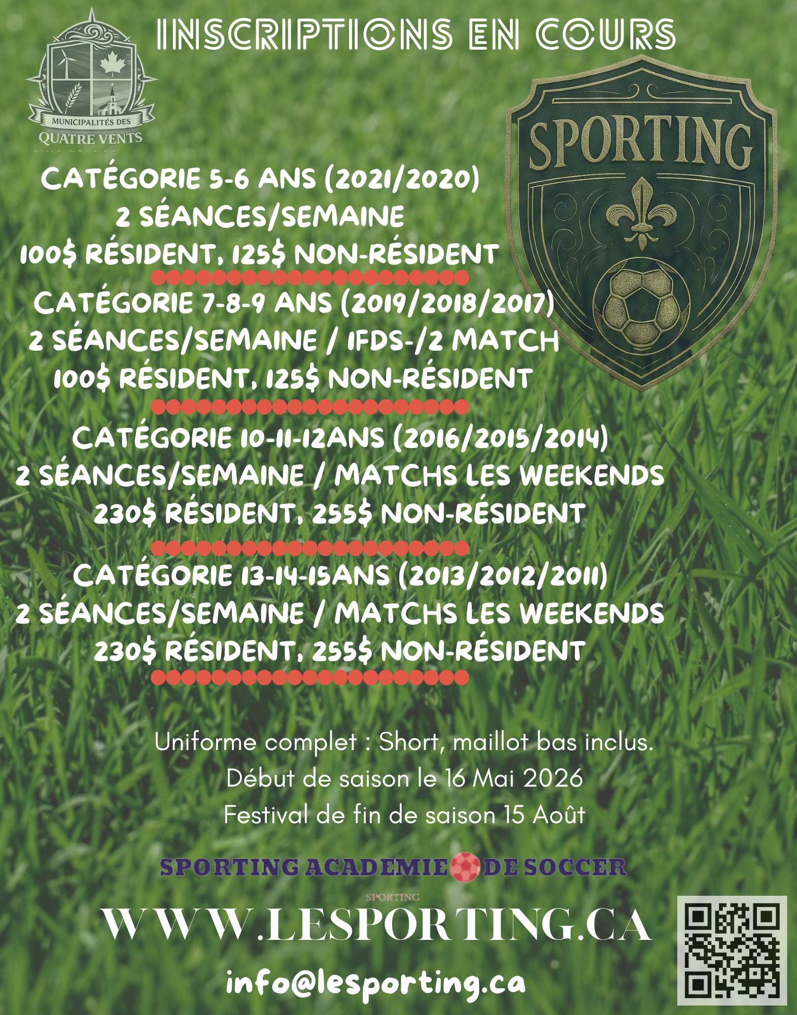 Le Sporting ne se limite pas à “jouer au soccer”. Chaque séance est construite pour développer des habiletés transférables vers le haut niveau : lecture du jeu, intelligence tactique, discipline, rigueur et plaisir du travail bien fait.
